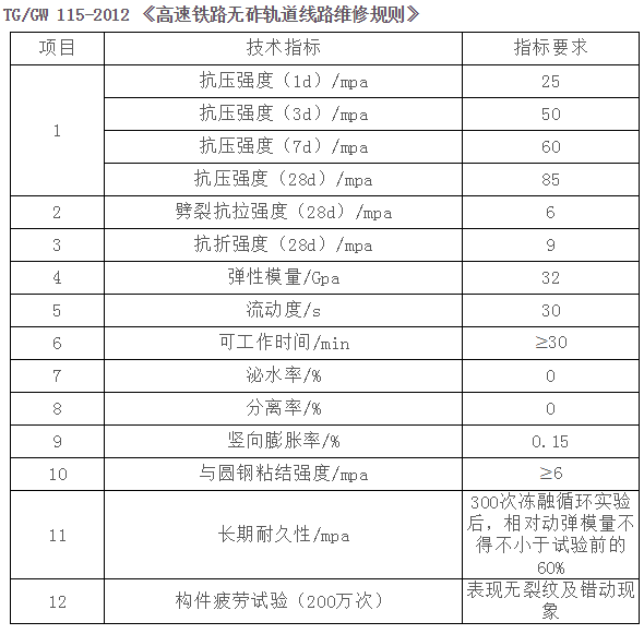 4、灌注過程:①攪拌:CGM-5砂漿的推薦配合比為水:料=19%,根據(jù)設計所需要的流動度可適當調(diào)節(jié)用水量,配合比范圍水料比18-20%,攪拌時間為3-5min。②灌注:將輸漿管接到道床板的灌漿孔上,直接進行灌注;并觀察模板上的排氣孔。當有漿體稠度與注入的稠度相同時,即可將排氣孔堵住,完成灌注。③清洗:每班澆筑完畢后,清洗攪拌機、輸漿管以及粘附有砂漿的工具。④拆模和養(yǎng)護:按一般的方法即可